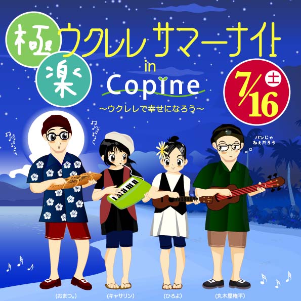 ウクレレで、思いっきり幸せな時間を過ごしましょう 日 時:7月16日(土) 時 間:開場17:30 開演18:00 会 場:コピンヌ 2011/6/22 |